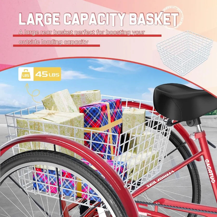 1/7-Speed Adult Tricycle 24/26-Inch 3-Wheel Cruise Bicycle with Basket for Seniors Stable and Reliable 3-Wheel Bike for Shoppin