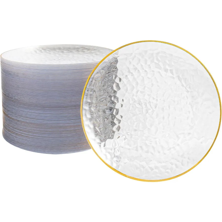 100Pcs Clear Gold Plastic Plates 7 Inch Hammered Disposable Heavy Duty Dessert Plates with Gold Rim Round Salad Plates for Wedd