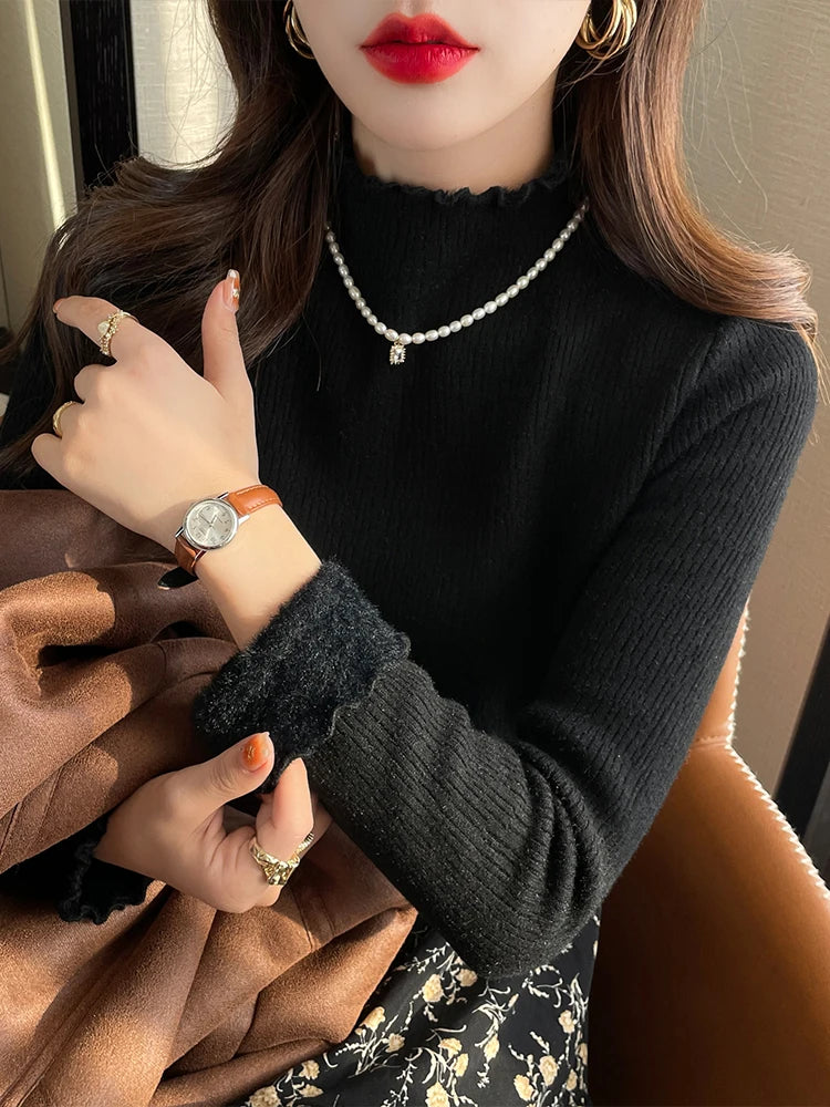 Autumn Elegant Casual Ruffles Knitted Sweater Fashion Women Mock Neck Pullover Solid Top Winter Warm Long Sleeve Knitwear Jumper