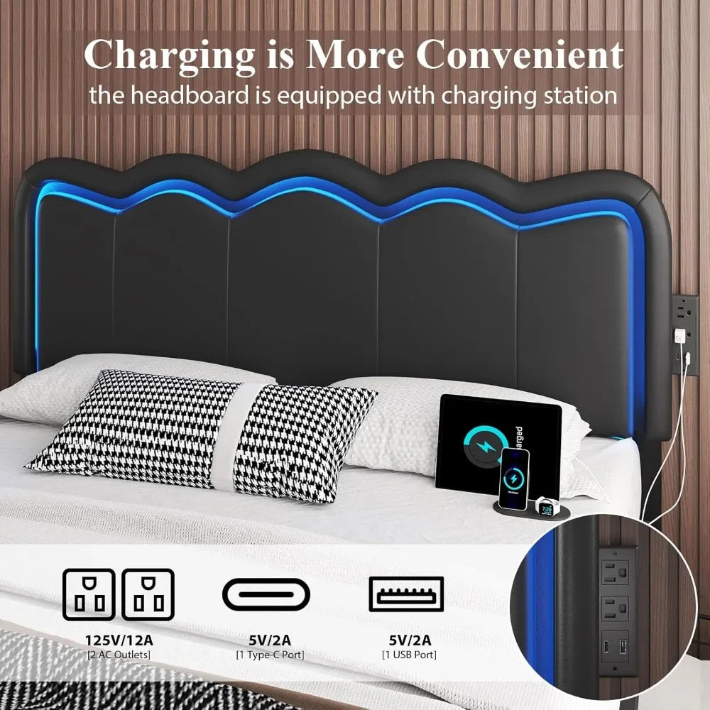 Bed Frame with 4 Storage Drawers and LED Lights, Upholstered Platform Bed with Adjustable Chic Double Wavy Headboard
