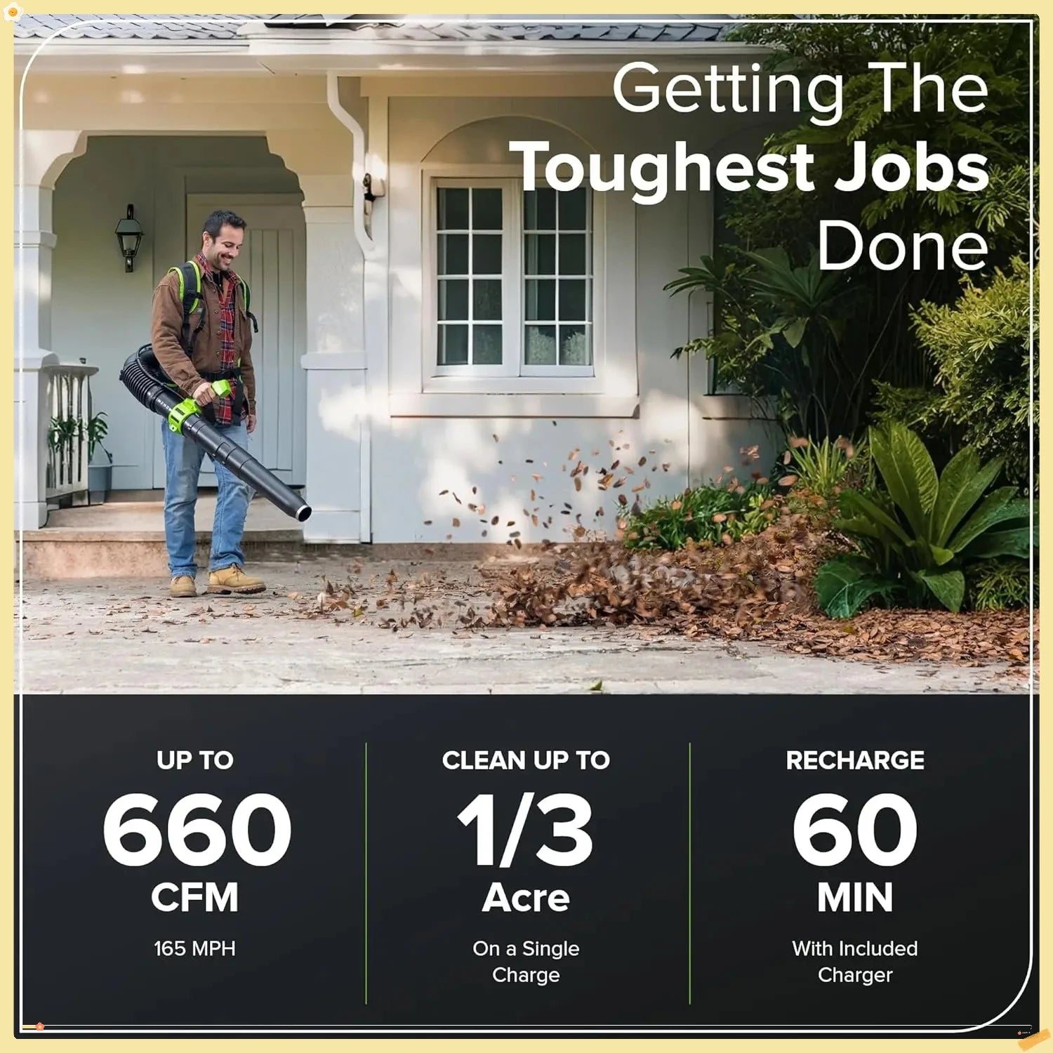 Brushless Backpack Leaf Blower, Commercial-Grade Power for Yards, Patios, Includes 5.0Ah Battery & 5A Rapid Charger