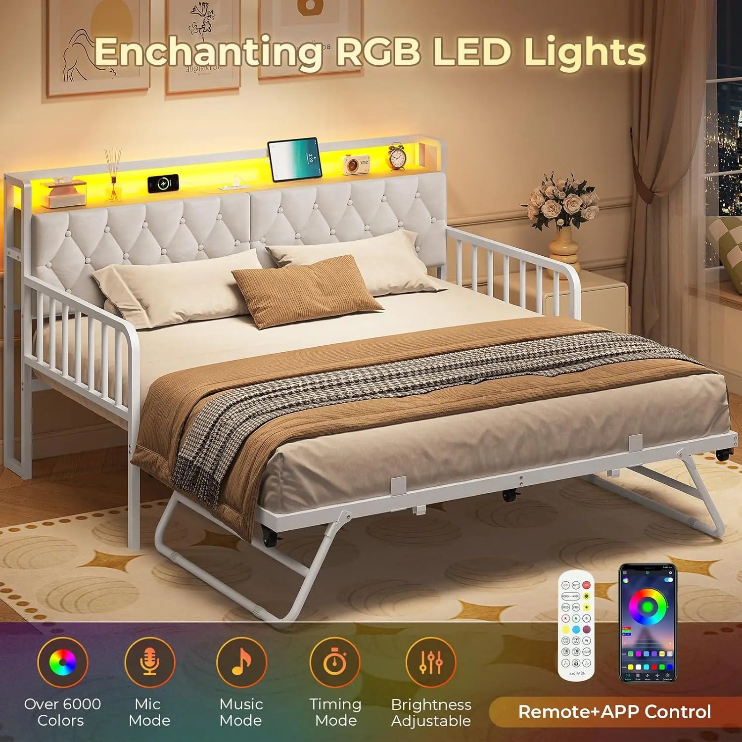 Daybed with Trundle, Twin to King Daybed with Charging Station & LED Lights, Metal Trundle Bed Twin with Hidden Storage Headboar