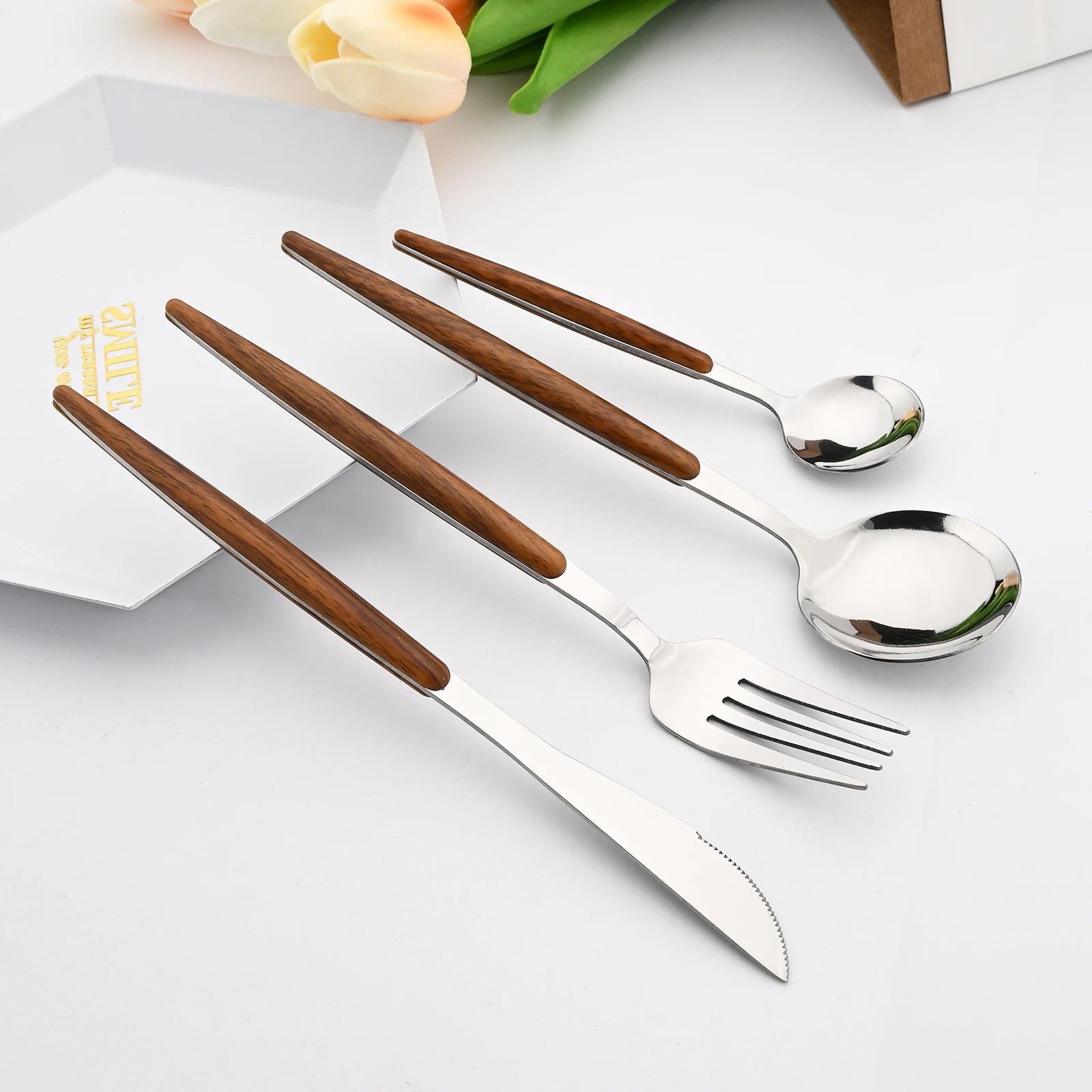Drmfiy 24Pcs Brown Silver Dinnerware Stainless Steel Imitation Wooden Handle Silverware Knife Spoon Fork Cutlery Set Tableware