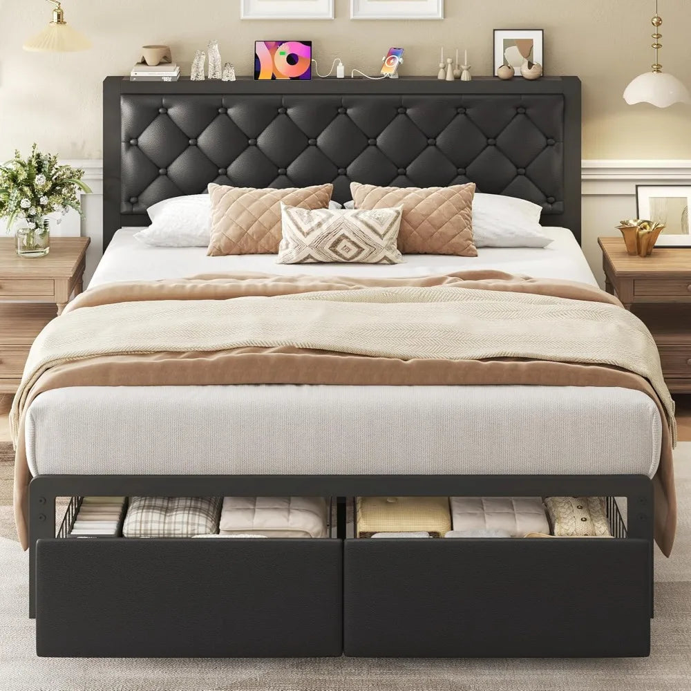 Frame with 2 Storage Drawers, Upholstered Headboard Button Tufted Bed Frame with Charging Station, No Box Spring Neede