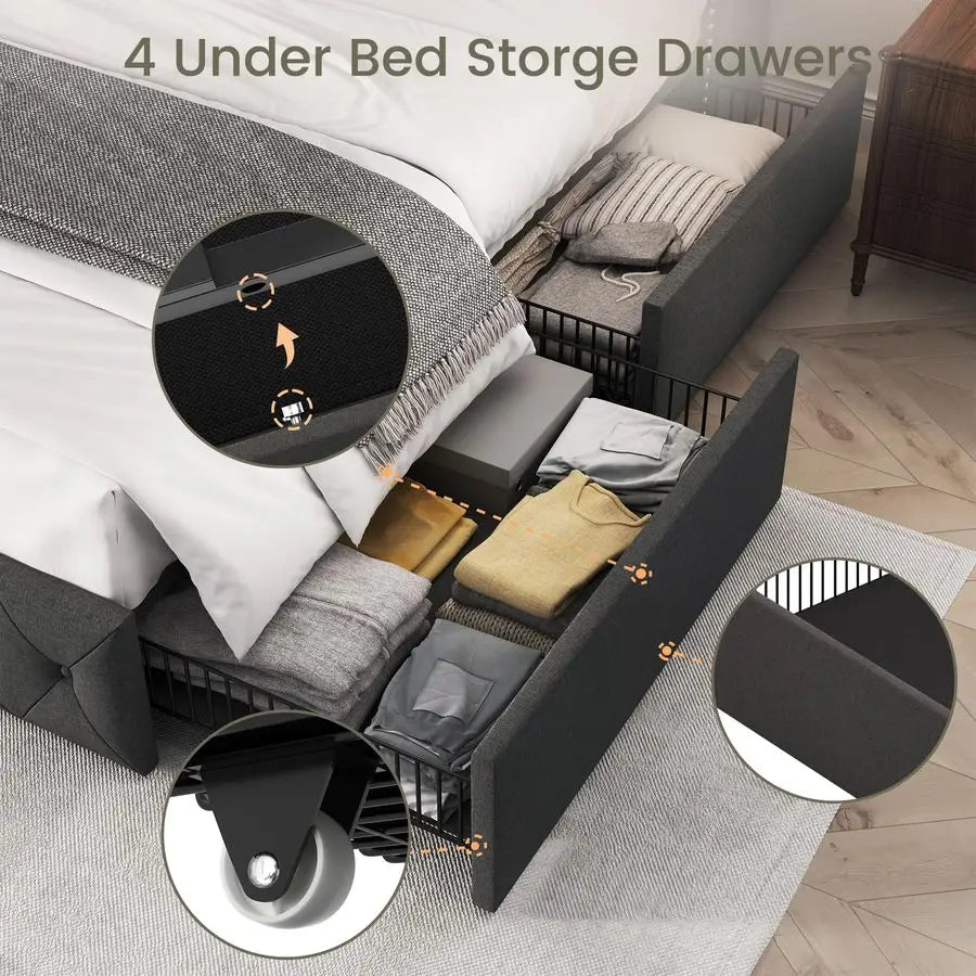 Full Size Bed Frame with 4 Storage Drawers and Wingback Headboard Linen Upholstered Platform Bed Frame Tufted Beds with Wooden S