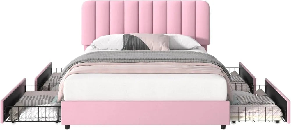 Full Size Upholstered Bed Frame with 4 Storage Drawers, Velvet Headboard, Wood Slat Support, No Box Spring Needed in Pink