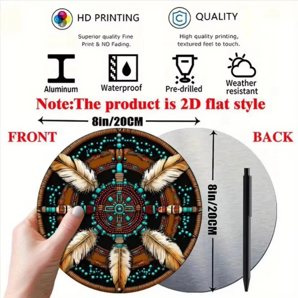 Native American-Themed 2D Flat Circular Aluminum Wall Plaque–8x8 Inch Vibrant Tribal Design in Turquoise, Orange, Brown & More"