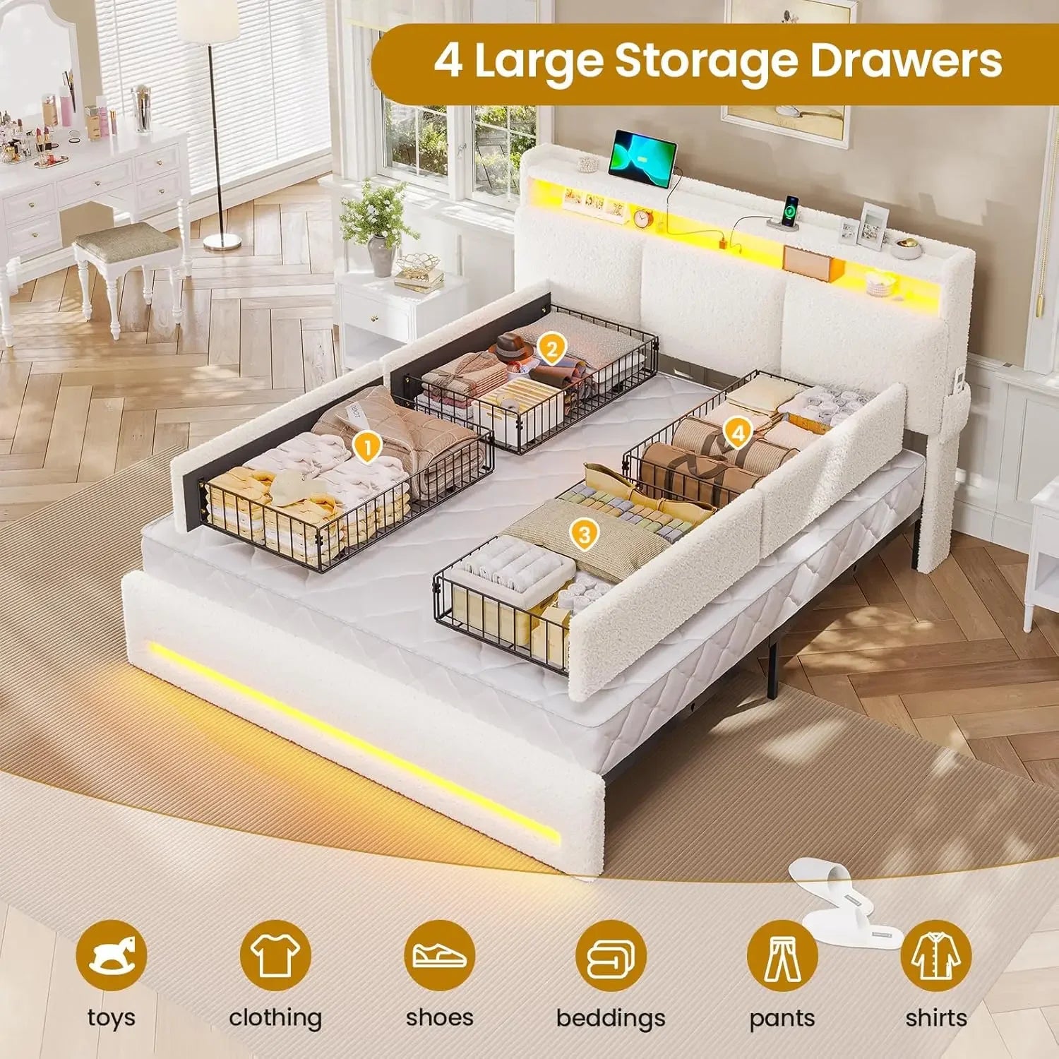 NEW Full Size Bed Frame with Storage Headboard and Charging Station, Boucle Upholstered Bed Frame Full Size with 4 Drawers