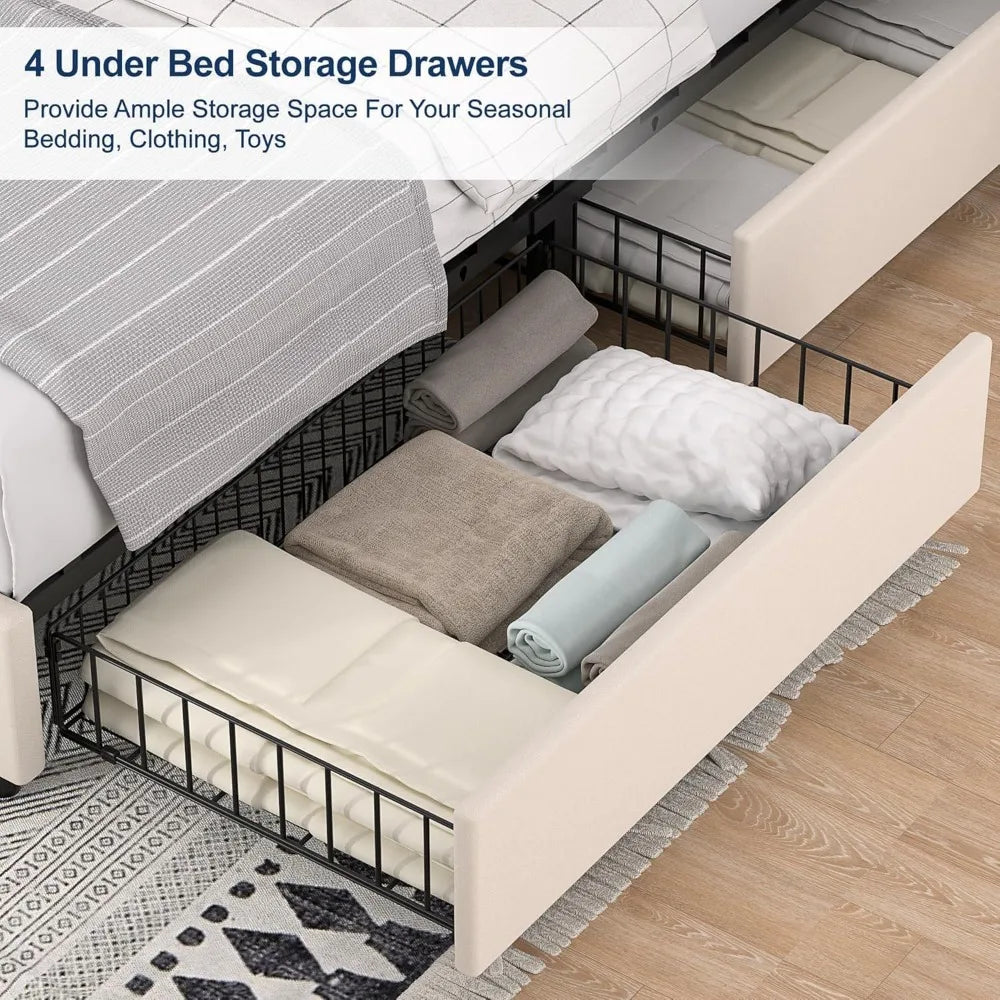 Queen Size Platform Bed Frame with Charging Stations & 4 Storage Drawers, Upholstered Adjustable Headboard, Wooden Slats Support
