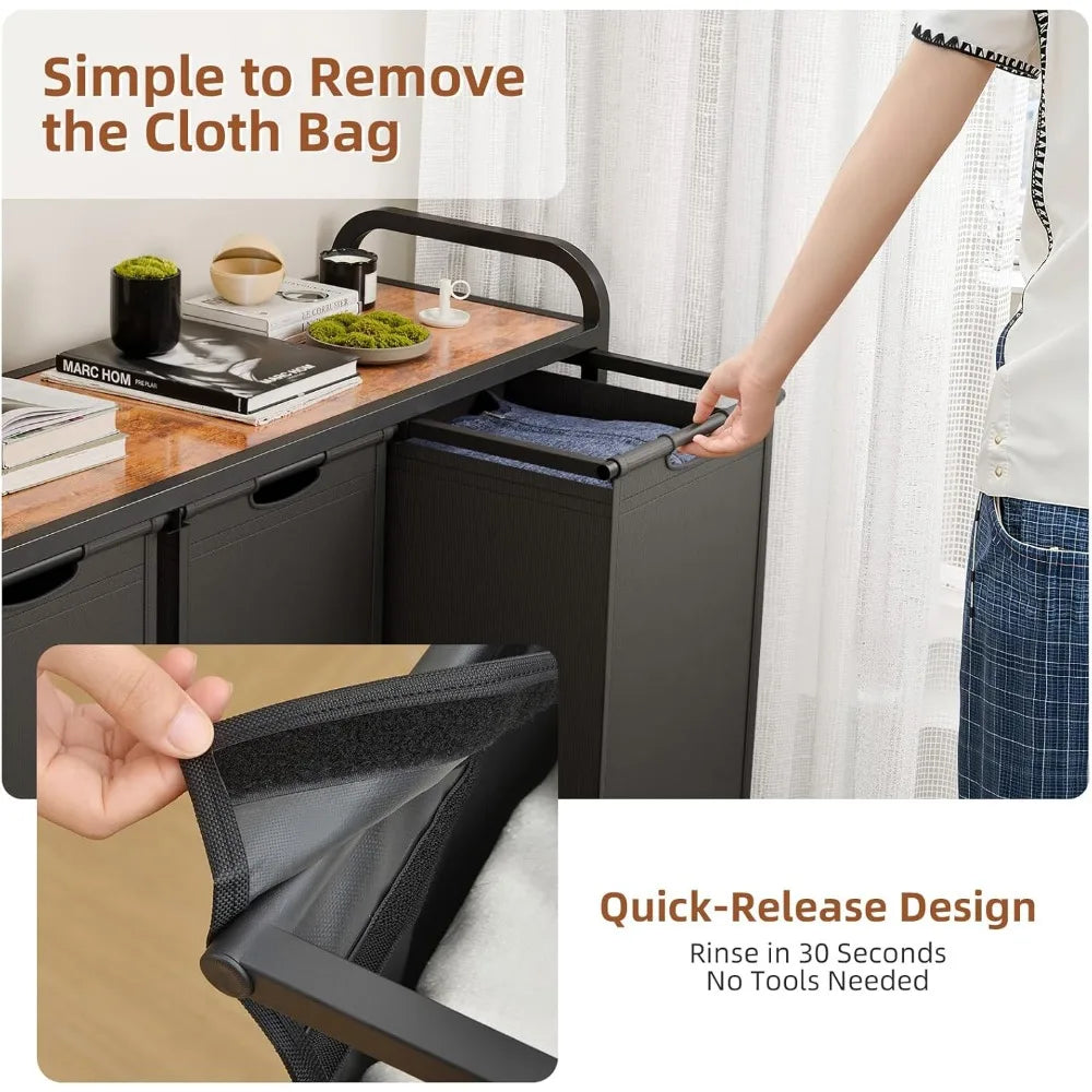 Rolling 3-Section Laundry Hamper with Pull-Out Bags, Top Shelf, and Wheels for Large Capacity Sorting