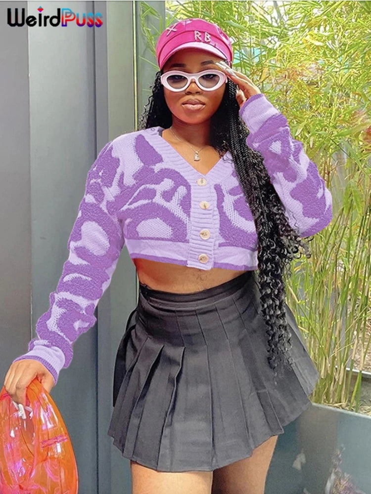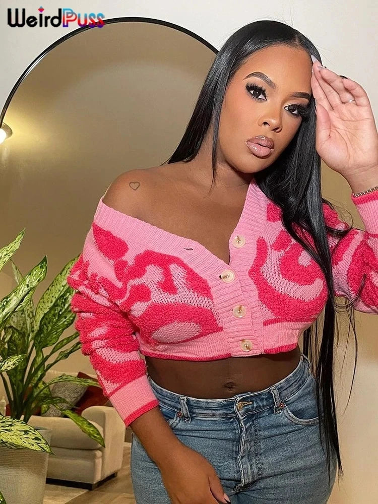 Weird Puss Casual Y2K V-Neck Button Cardigan Sweater Women Autumn Wild Stylish Long Sleeve Warm Streetwear Knit Classic Jumper