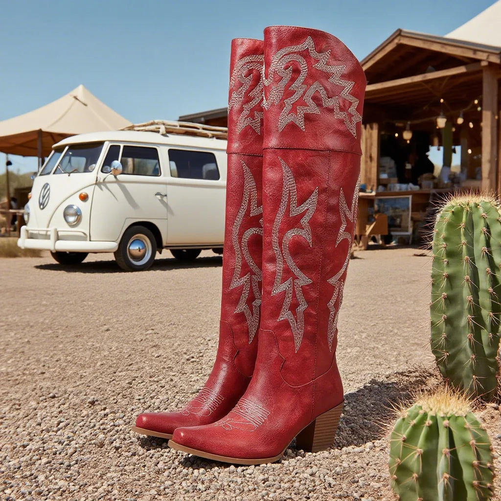 Women Over The Knee Western Boots Cowboy Chunky High Heel Square Toe Side Zipper Shoes Vintage Leisure Dressy Cowgirl Boots US